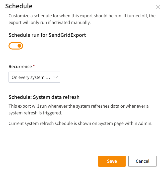 - To activate the scheduled export automatically, click on the Schedule run button to set On. If turned off, the export will only run if activated manually.