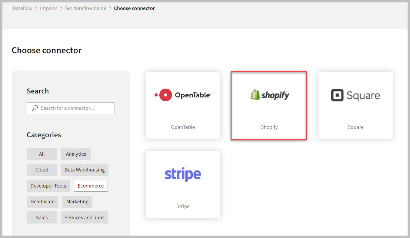 - In the All categories or Ecommerce tab, select the Shopify connector to start the configuration.