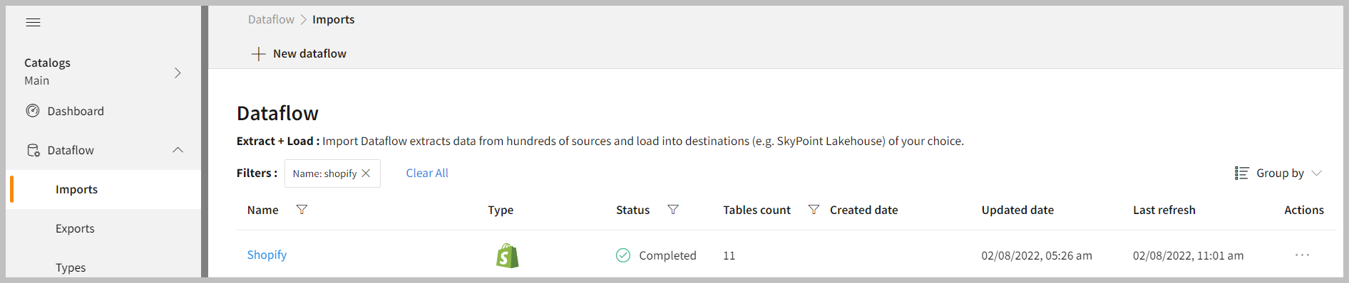 - After saving the connection, the Shopify connector appears on the Dataflow page. Also, you can see the list of created tables in the Databases section.