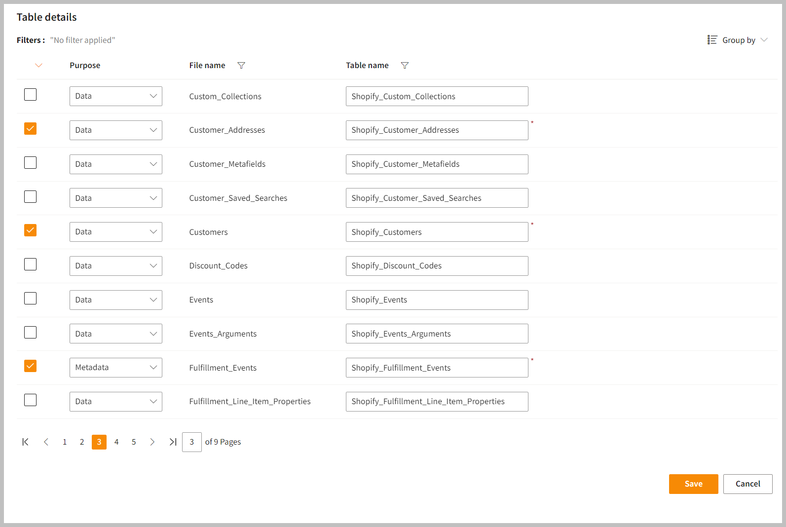 | Purpose | Option to assign a purpose (Data, Metadata) for each table. |