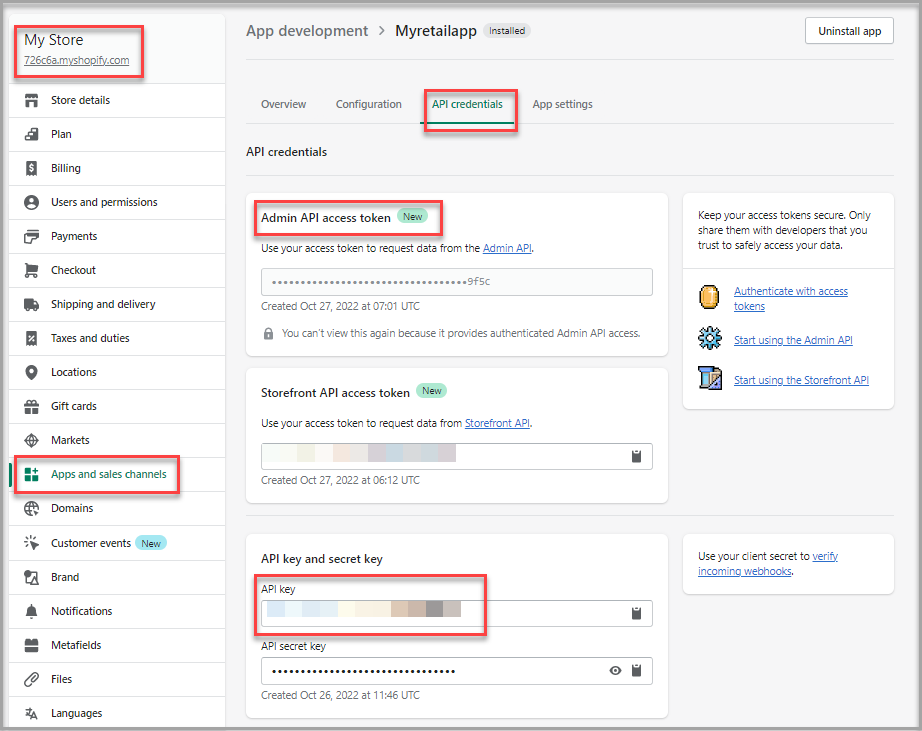 Follow the below step to find the required credentials for configuring Shopify import connector:- Go to Apps and sales channels > API credentials to find the API key, API access token, and URI.