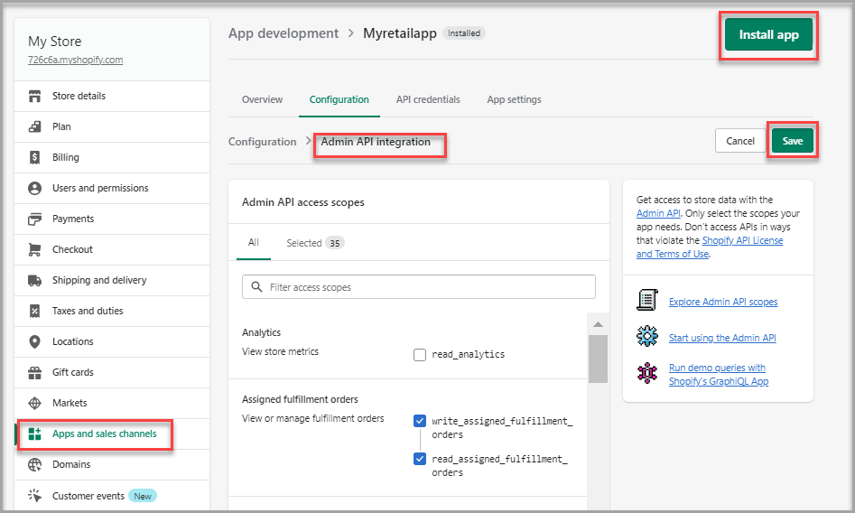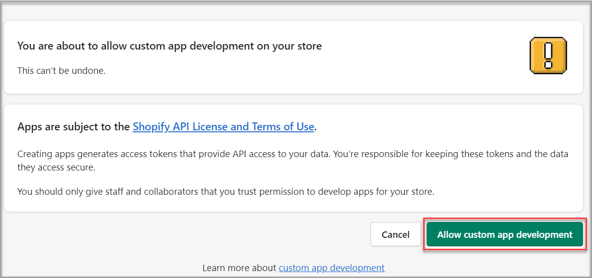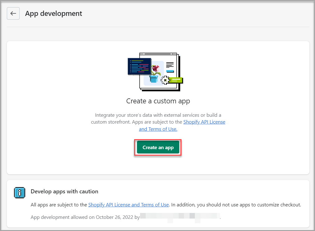 You require an active Shopify store and relevant permissions to create a custom app as well as assign API scopes.Enable Custom app development