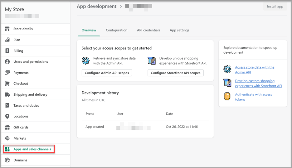 - Click Create an app to integrate your store’s data with external services or build a custom storefront.