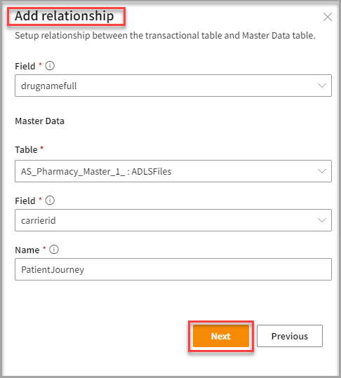 Follow below steps to connect your activity data to corresponding customer record in the Add Relationship form:- Select the id which links Transactional table to Master data table from the Field drop-down list.