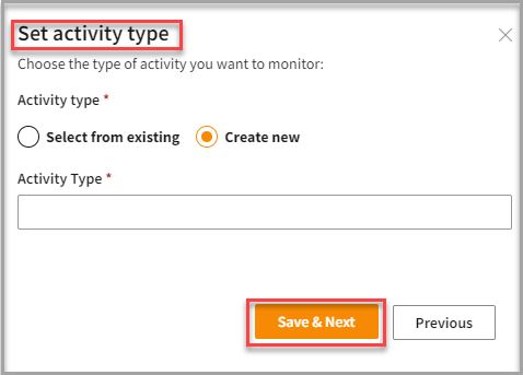 Follow below steps to choose the type of activity you want to monitor:- Select activity type Select from existing or Create new in Set activity type form. If an activity type is not relevant for the new activity, choose Create new.