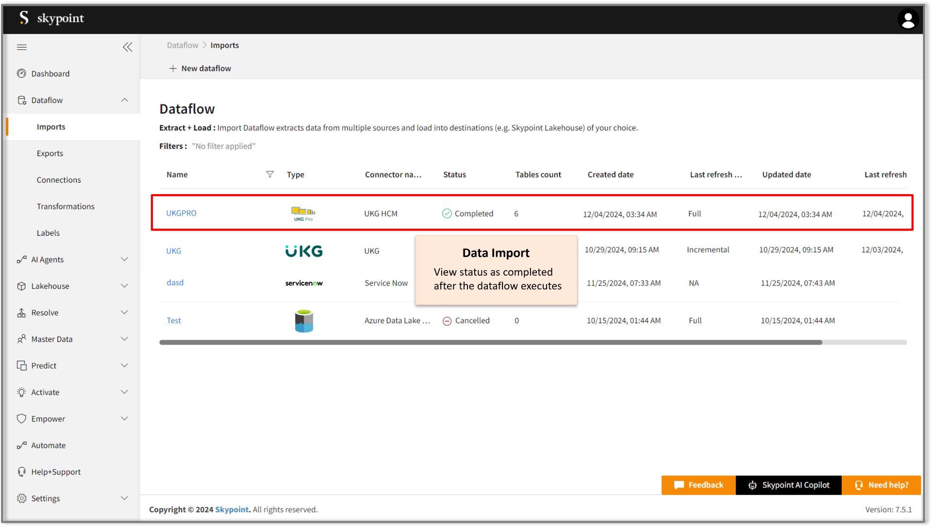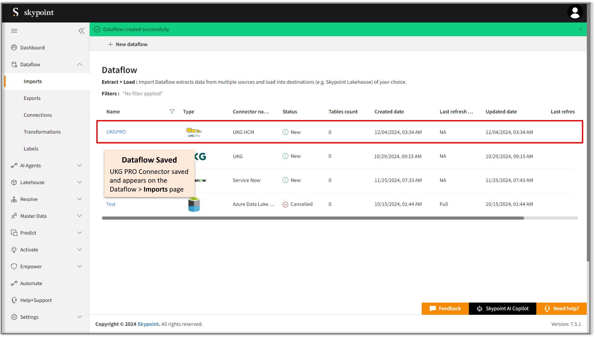 Congratulations ! for saving the UKG PRO connector dataflow, which appears on the Dataflow > Imports page.
