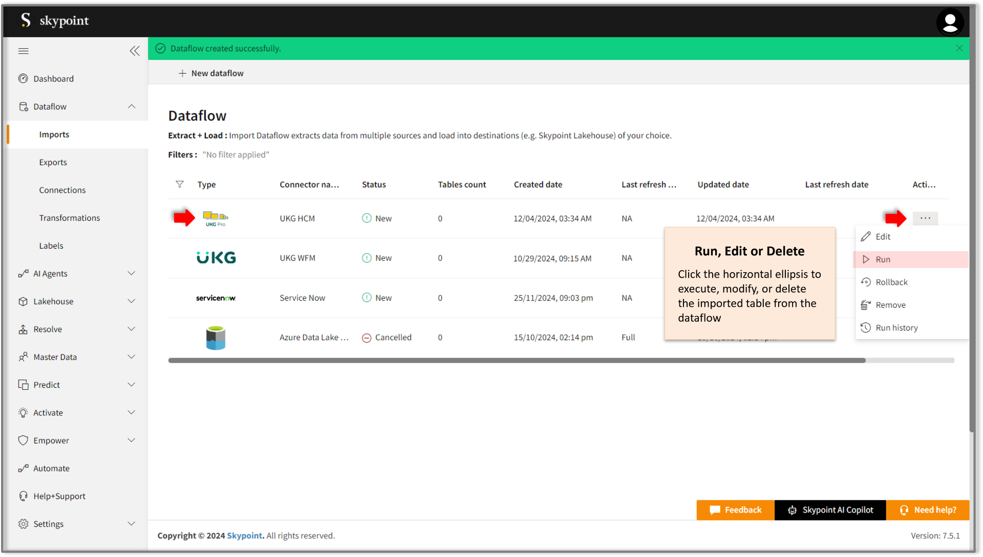 | Modify the Dataflow | Select Edit and modify the Dataflow. Click Save to apply your changes. |