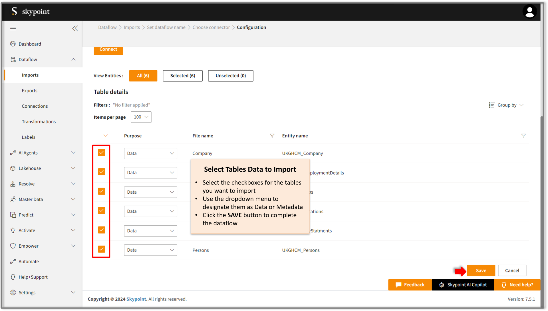 By default, all tables in the Table Details section are selected. You can choose to import only specific tables that are relevant to your data processing needs. For example, to import customer data, select tables containing details like name, email, address, and contact information.