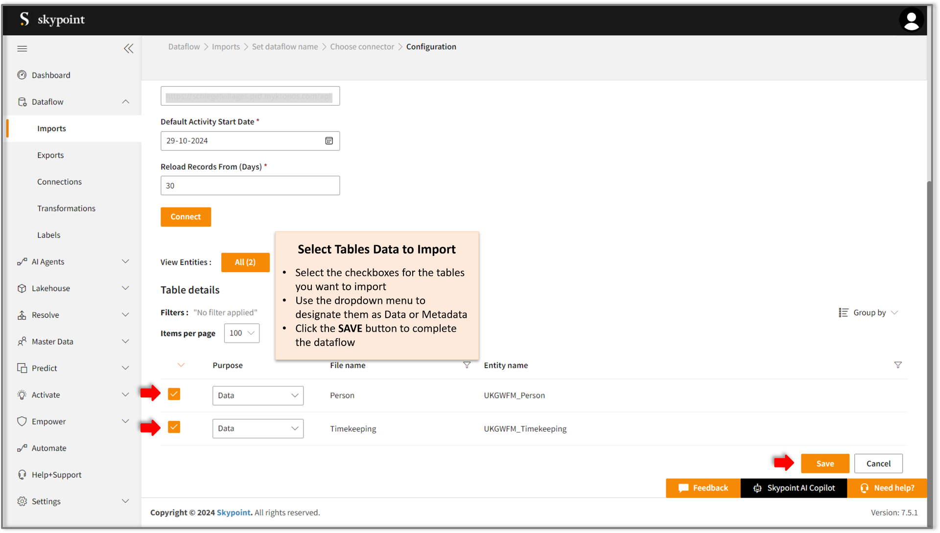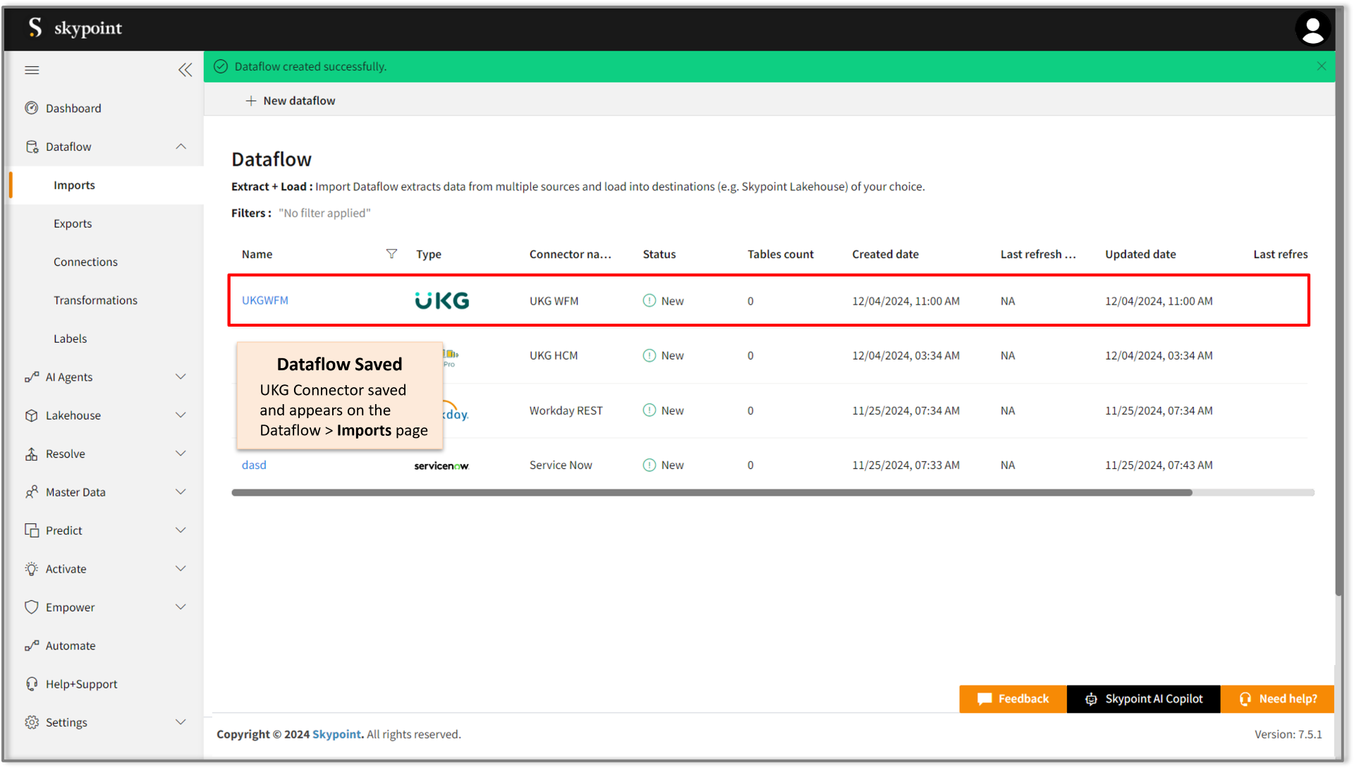 Congratulations ! for saving the UKG WFM connector dataflow, which appears on the Dataflow > Imports page.