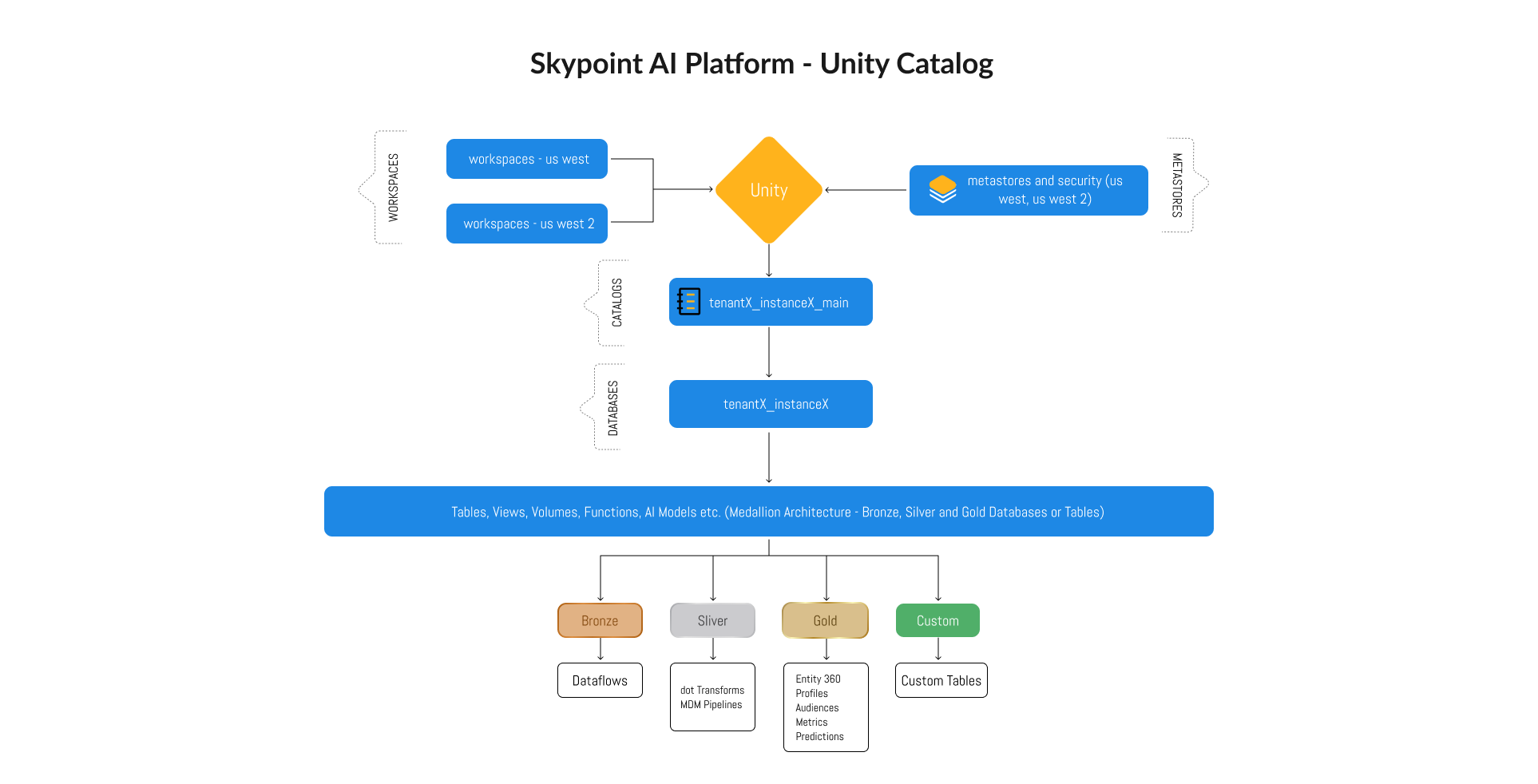 Skypoint AI leverages Unity Catalog for centralized data governance, ensuring secure management of data and AI assets across Lakehouse SQL and multiple workspaces.