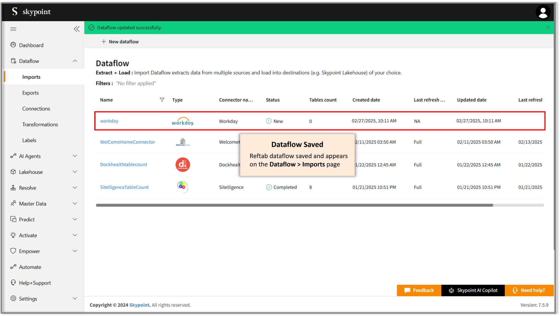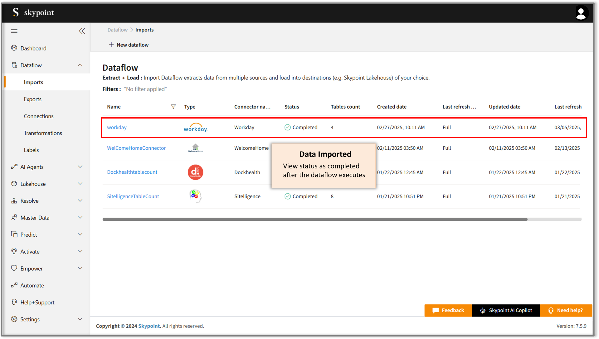 After saving the connection, the Workday connector appears on the Dataflow > Imports page.