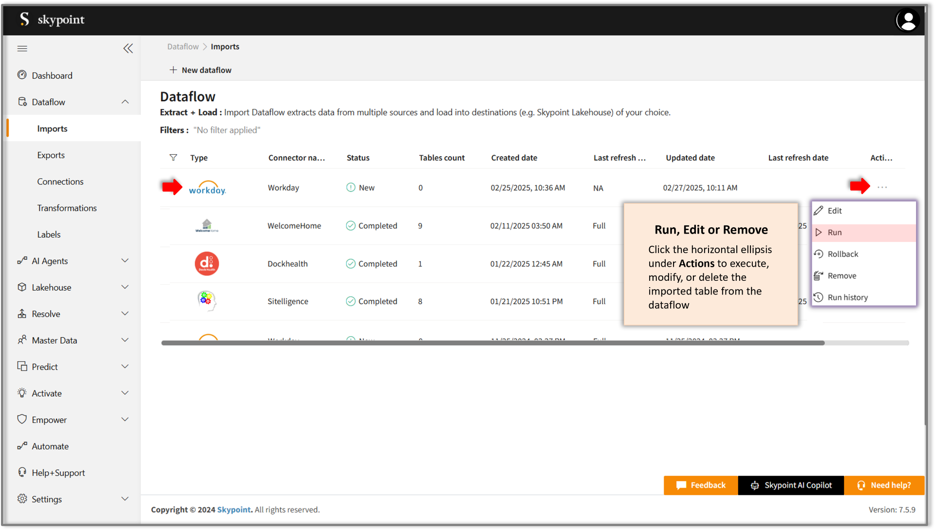 Once the table is imported, you can execute, modify, and remove the imported table from the Dataflow. Follow the below steps: