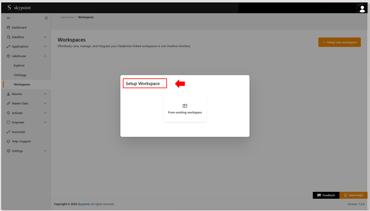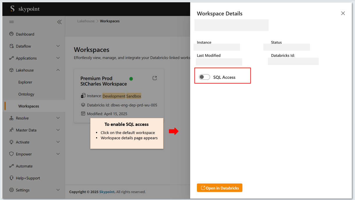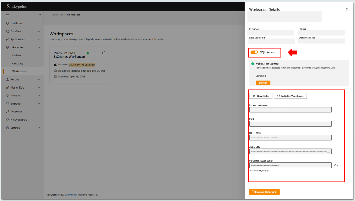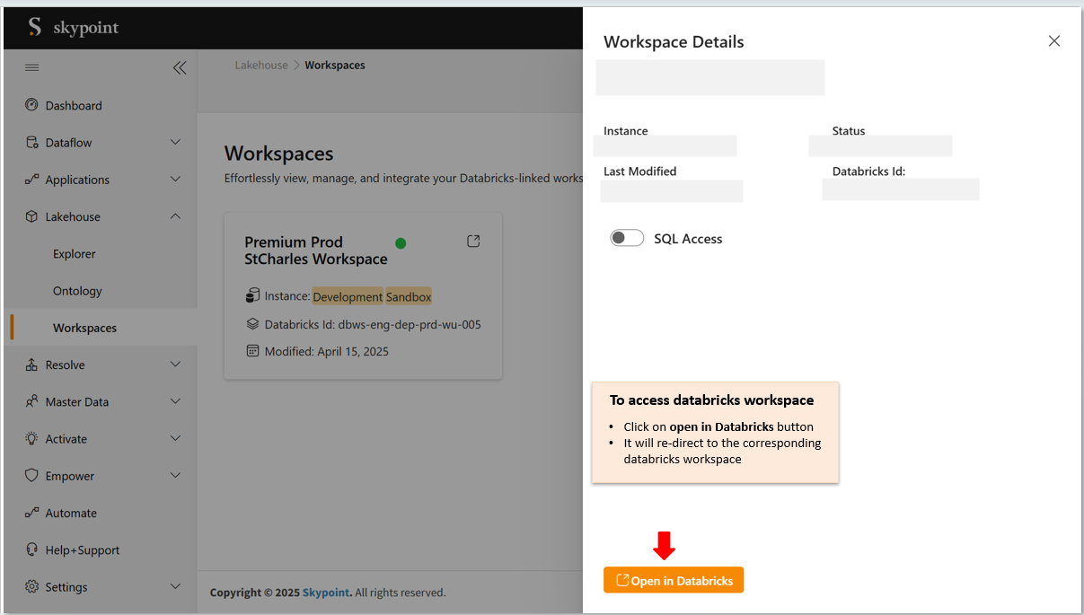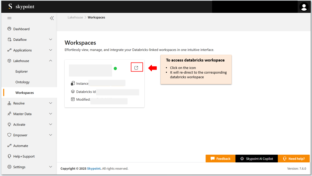 To open the workspace in Databricks, directly from the Skypoint AI studio- Click on arrow icon present on workspace you want to access.