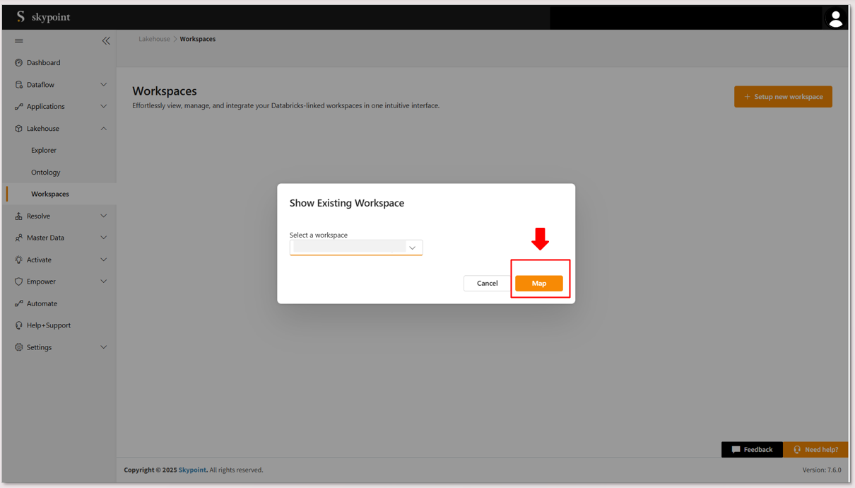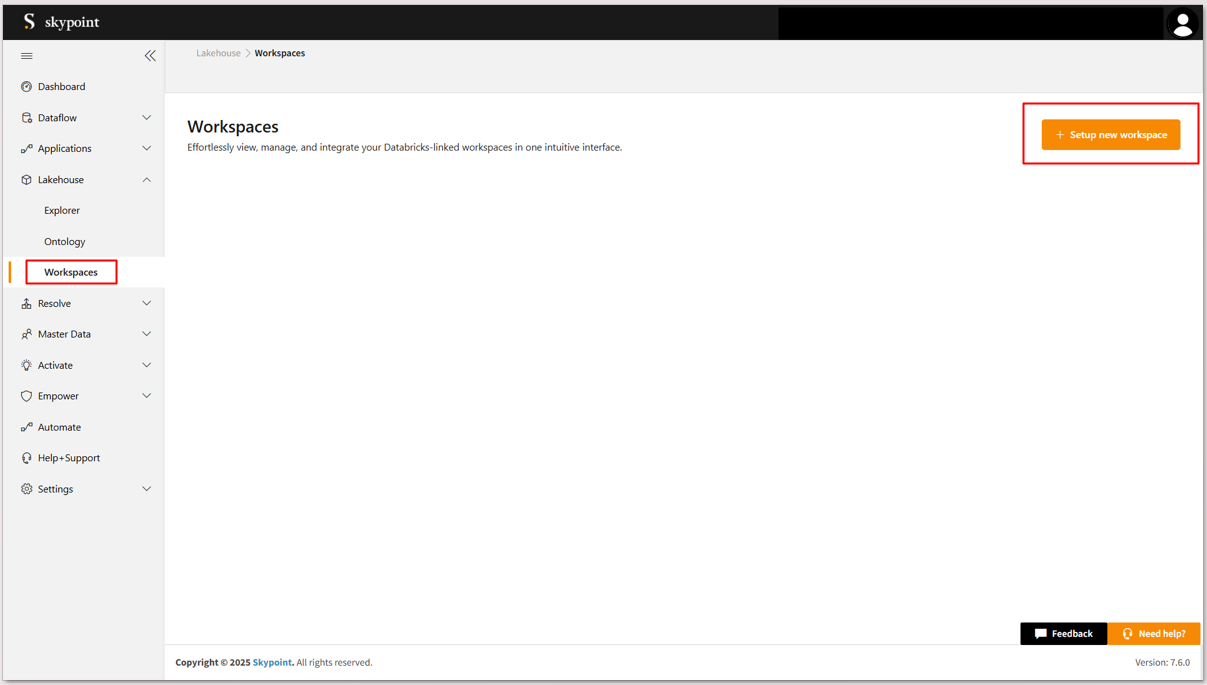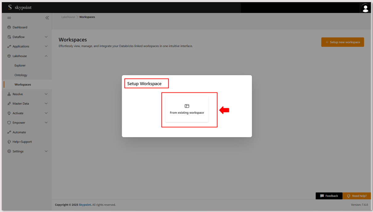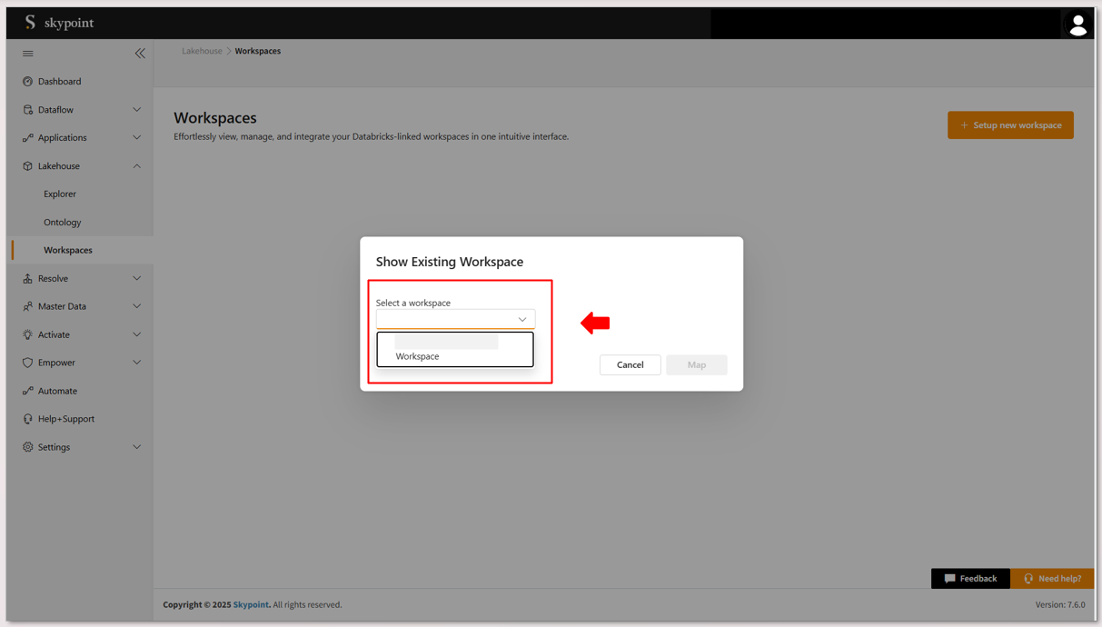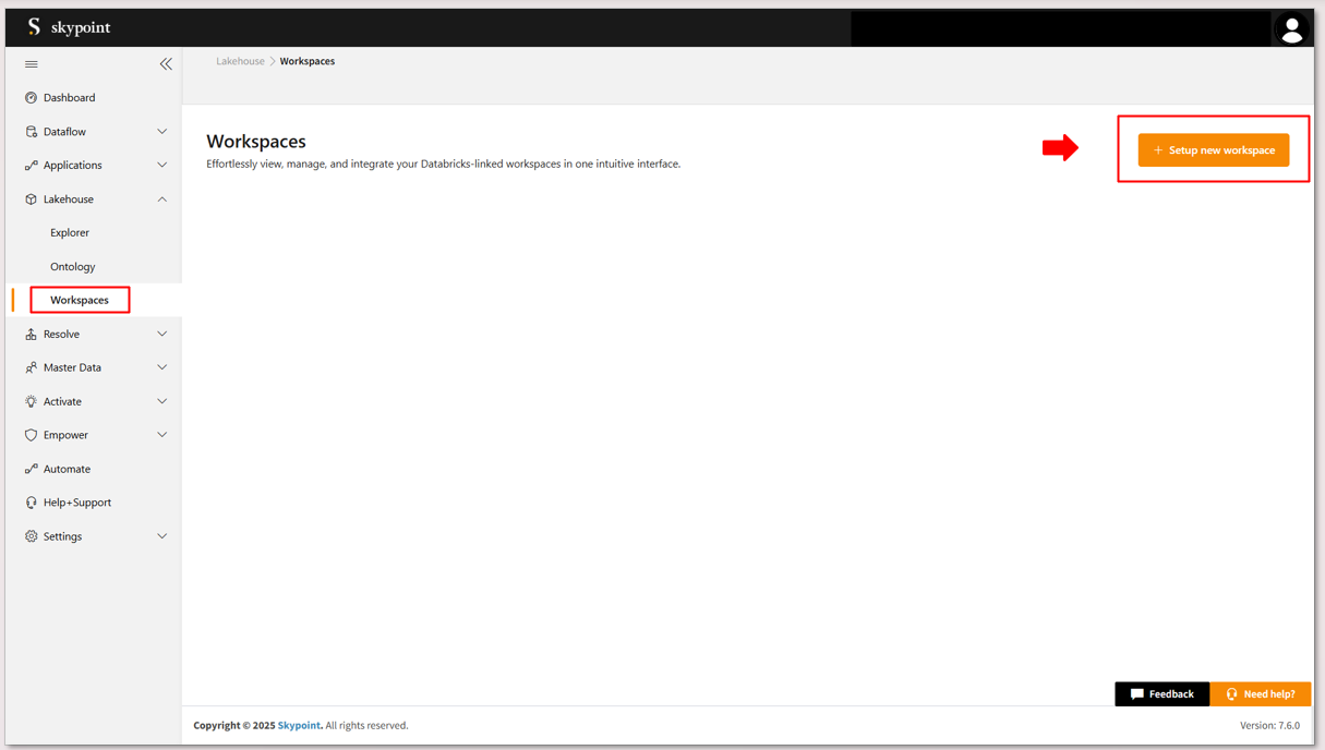 To open the workspace in Databricks, directly from the Skypoint AI studio- Click on arrow icon present on workspace you want to access.